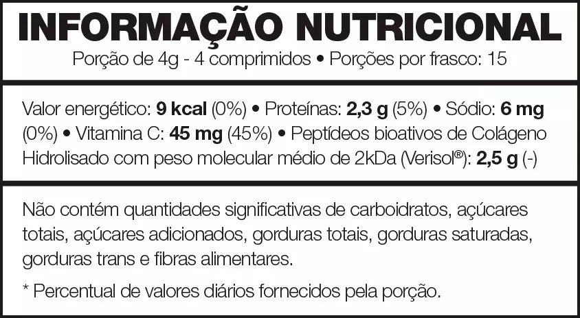 Peptídeos bioativos de colágeno hidrolisado com peso molecular médio de 2kda (Verisol®), ácido ascórbico (vitamina C), agente de massa celulose microcristalina, estabilizante polivinilpirrolidona, antiumectante dióxido de silício, lubrificante estearato de magnésio, revestimento: glaceante hidroxipropilmetilcelulose (hpmc), espessante polietilenoglicol e talco, estabilizante polivinilpirrolidona e corante carmin de cochonilha. NÃO CONTÉM GLÚTEN.